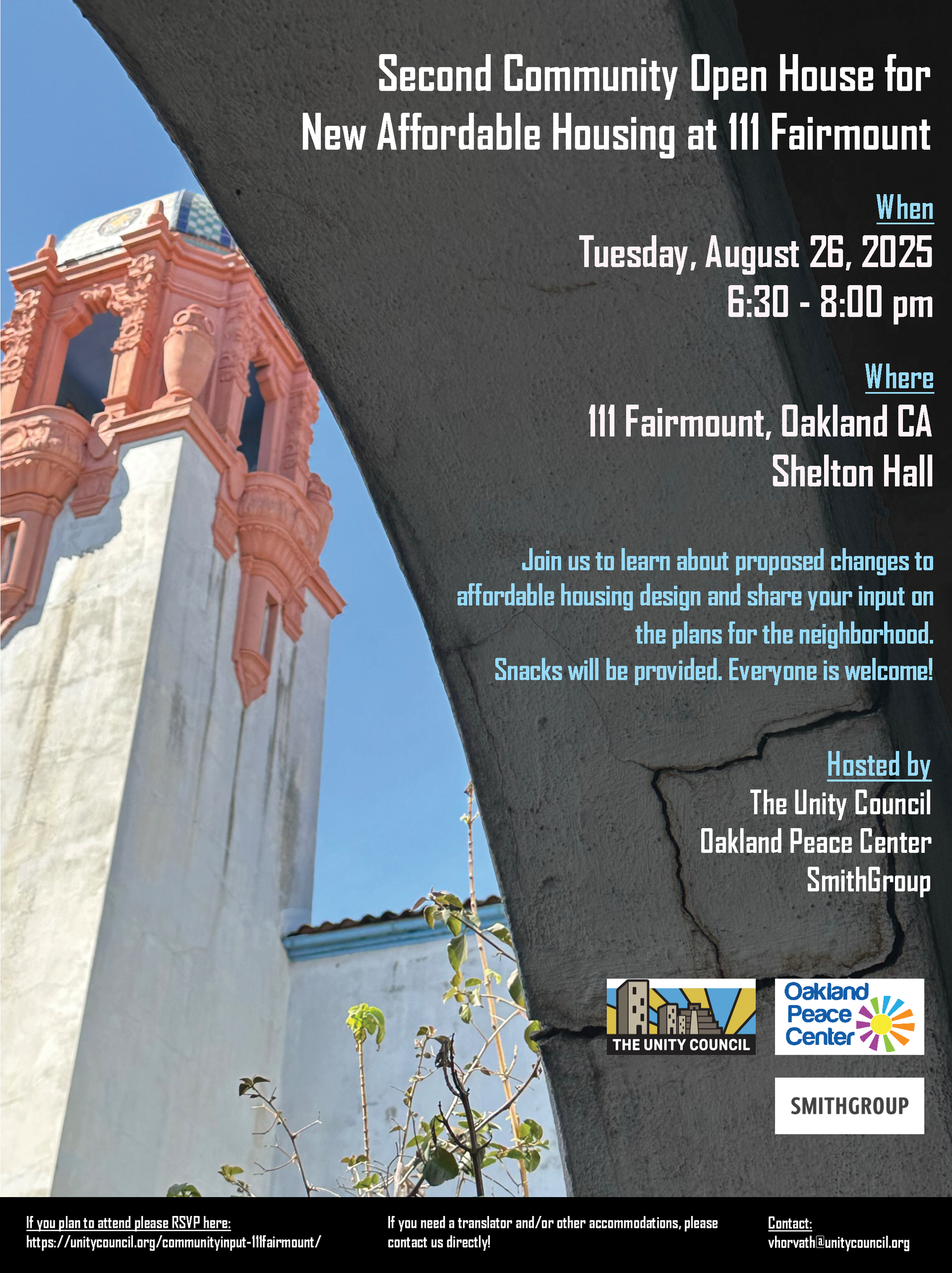 | | | Having a safe place to call home is essential for peace. Join us at Oakland Peace Center on Tuesday, 8/26 from 6:30 to 8:00pm to learn more about our affordable housing development.