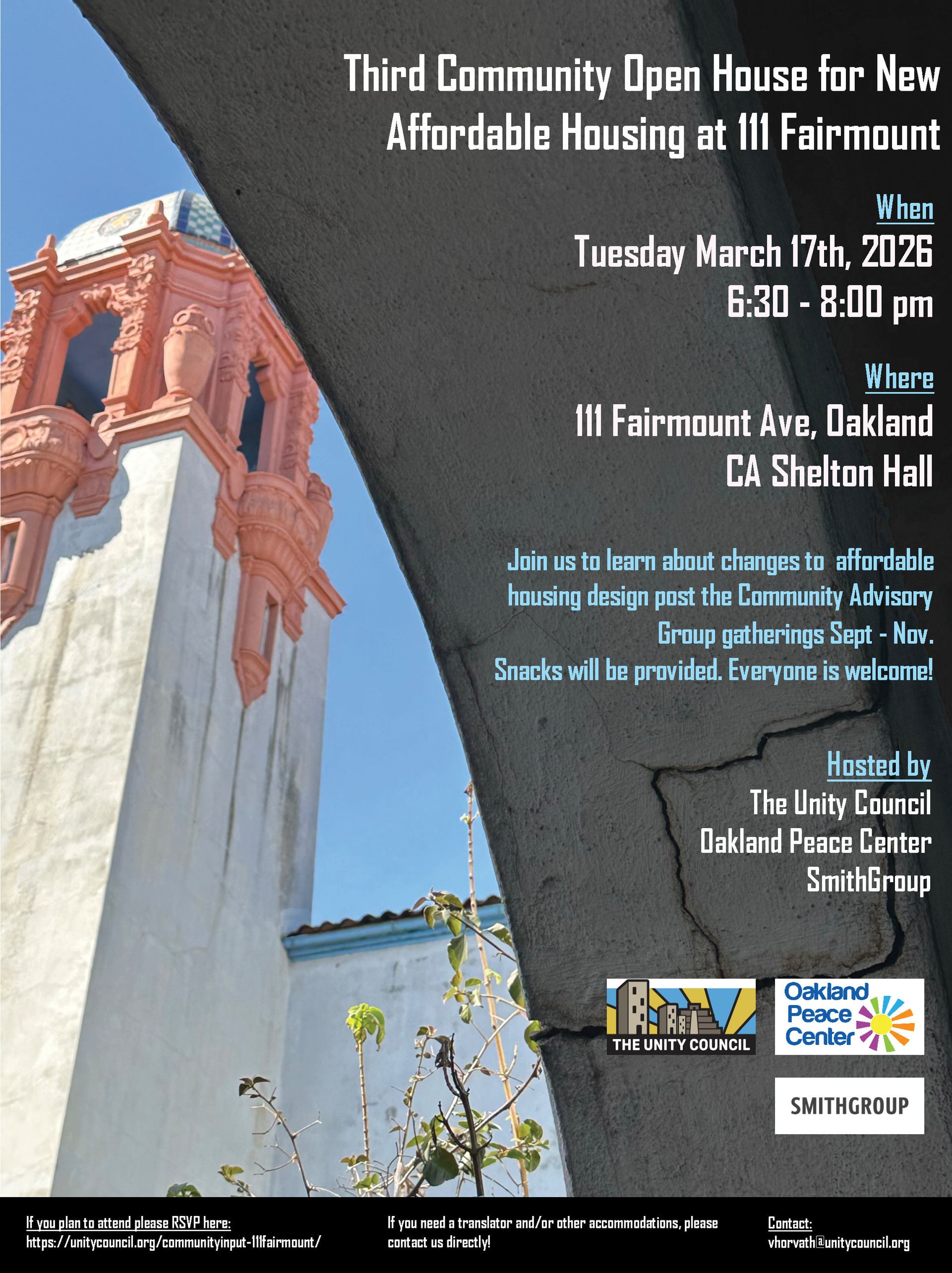 You're invited to a community meeting where we'll share design updates for the proposed affordable housing project at 111 Fairmount Ave. This meeting will bed led by our developer partners at The Unity Council and SmithGroup.
