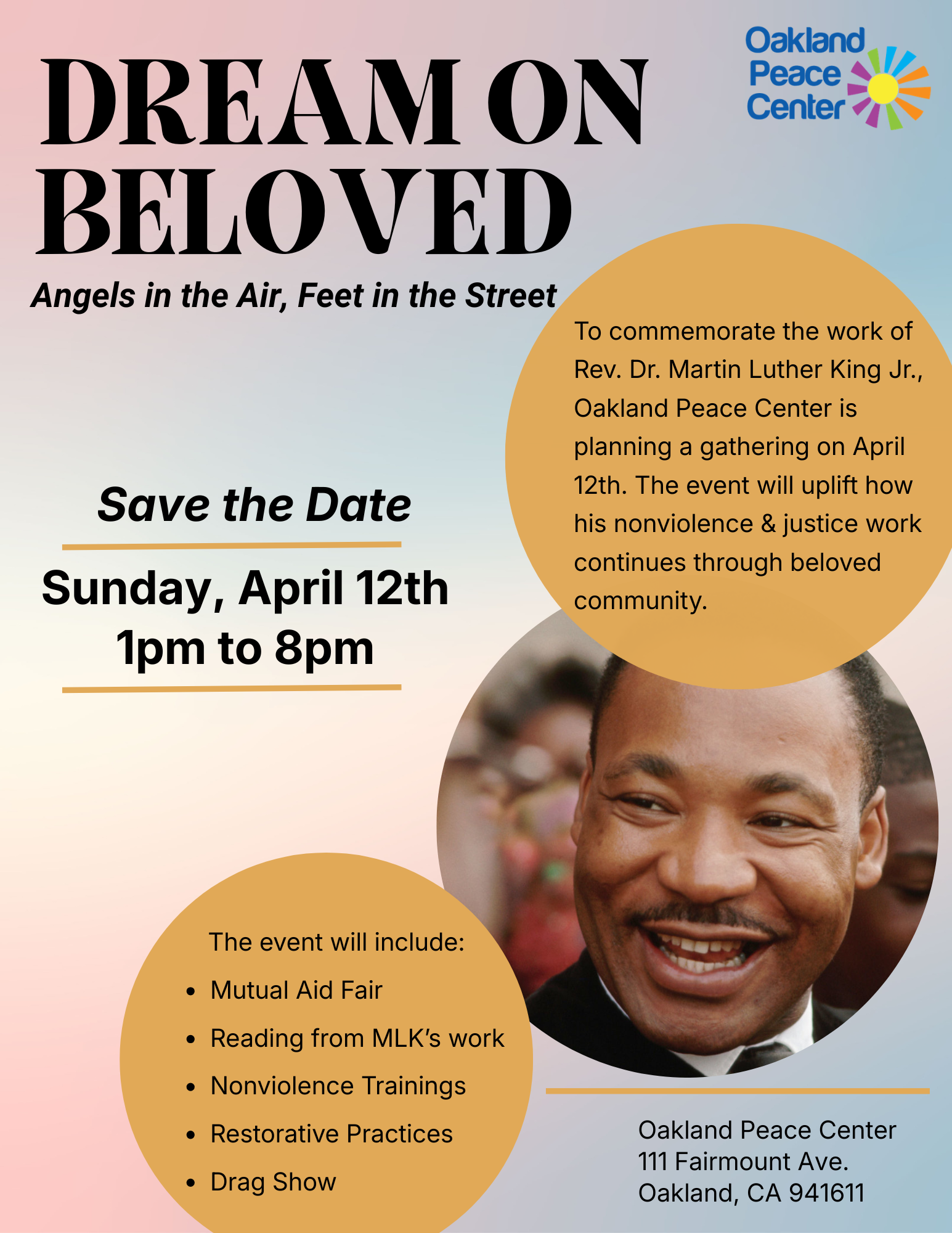 | Save the date, Sunday, April 12th for Dream On Beloved! This gathering at Oakland Peace Center will uplift how Rev. Dr. Martin Luther King Jr.'s nonviolence and justice work continues through beloved community.